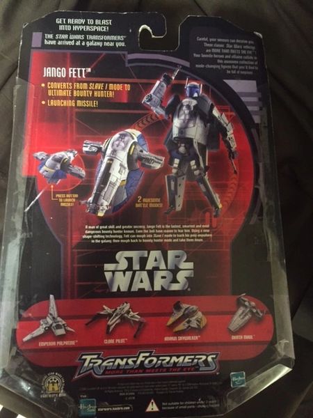 Two exciting kinds of toys comes together! Star Wars as a Transformer! Rare 2006 Transformer as Jango Fett's Slave 1 Spaceship. Package includes Jango Fett pilot figure, missile launching jet backpack, and two blaster pistols.